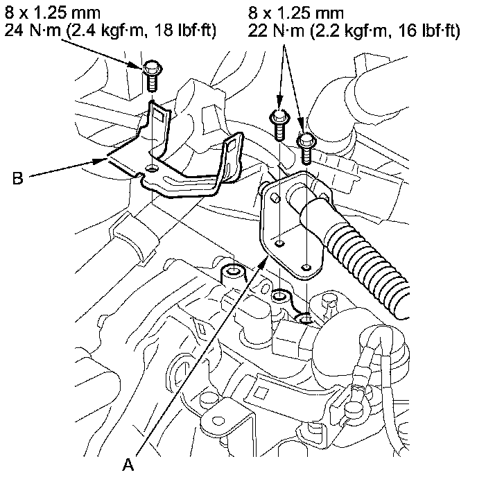 24. Install the IMA motor power cable clamp (A) to the clamp bracket (B).