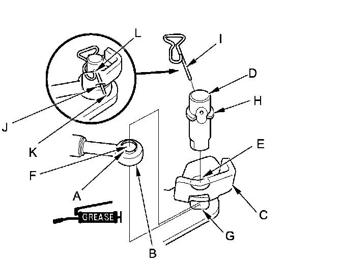 21. Insert the lock pin (I) in the direction shown through the control pin hole and out the opening (J) of the selector control lever so that the hooked end (K) of the lock pin locks into the countersunk hole (L) of the control pin.