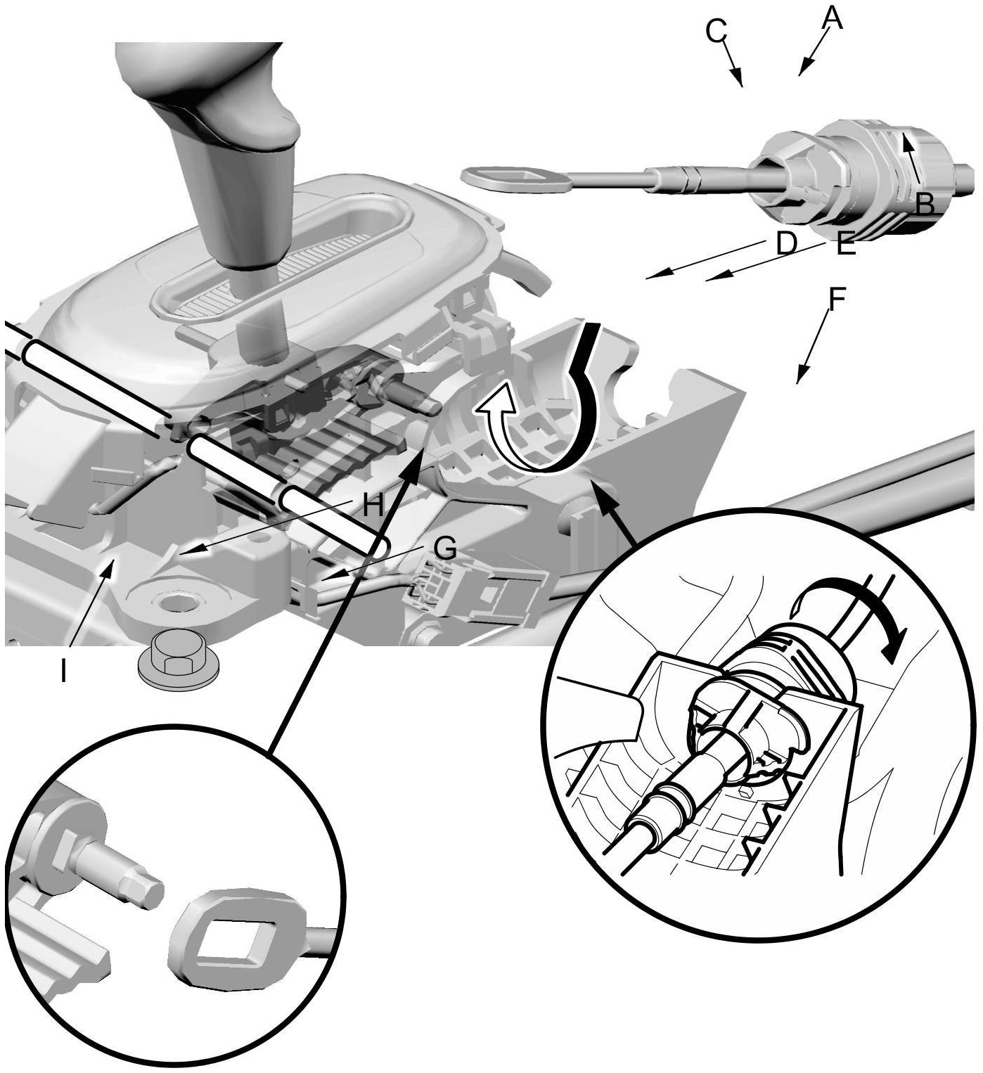 31. Rotate the socket holder (A) on the shift cable (B) to place the corner (C) on the holder opposite the opening (D) in the shift lever bracket base (E). Align the socket holder with the opening in the bracket, then slide the socket holder into the shift lever bracket base. Rotate the socket holder clockwise (F) a quarter turn until the socket holder stops to secure the shift cable. Install the shift cable end (G) over the mounting stud (H) by aligning its square hole with the square fitting (I) at the bottom of the stud.
