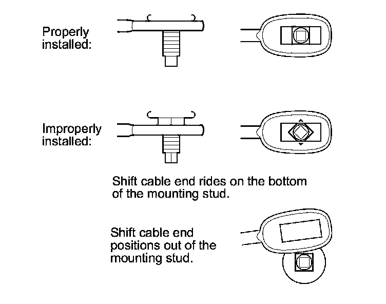 33. If the cable end is out of position on the mounting stud, remove the shift cable from the bracket, and reinstall the shift cable. Do not install the shift cable end on the mounting stud while the shift cable in on the bracket. If the cable end rides on the bottom of the mounting stud, rotate the stud and align the square fitting with the hole.