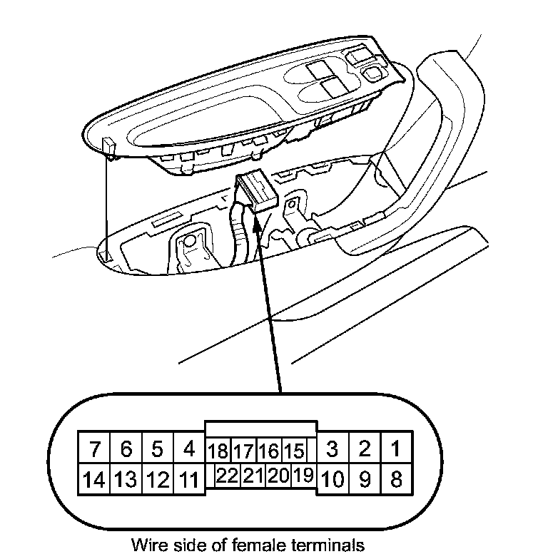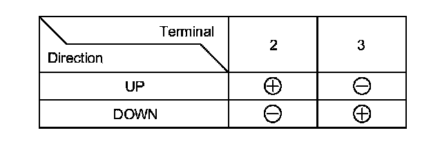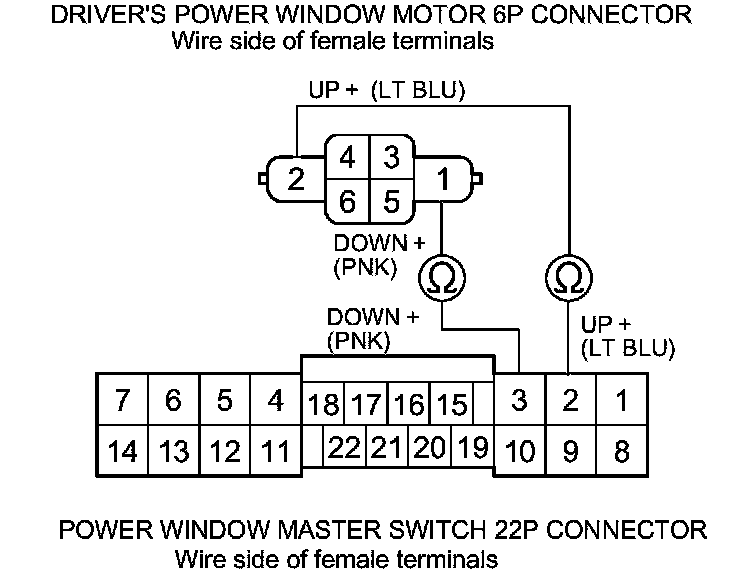 2. Test the motor in each direction by connecting battery power and ground to the power window master switch 22P connector according to the table.
