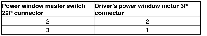 6. Check for continuity between the power window master switch 22P connector terminals and the driver's power window motor 6P connector terminals as shown: