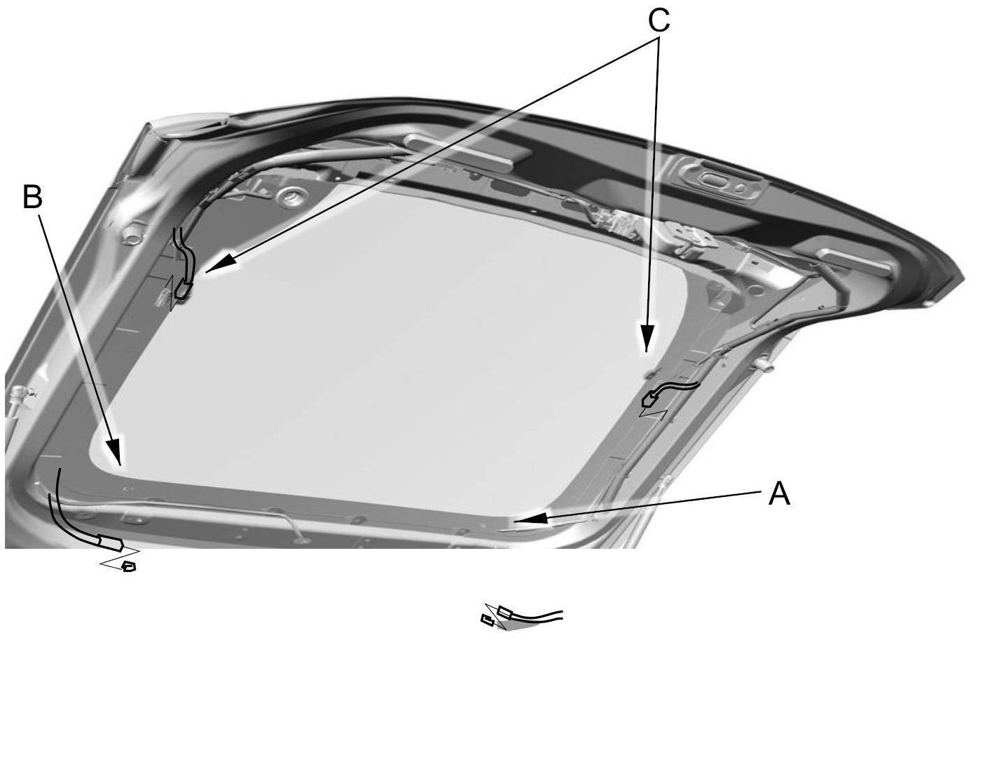 3. Disconnect the window antenna connector (A), the hatch ground connector (B), and the upper rear window defogger connectors (C).