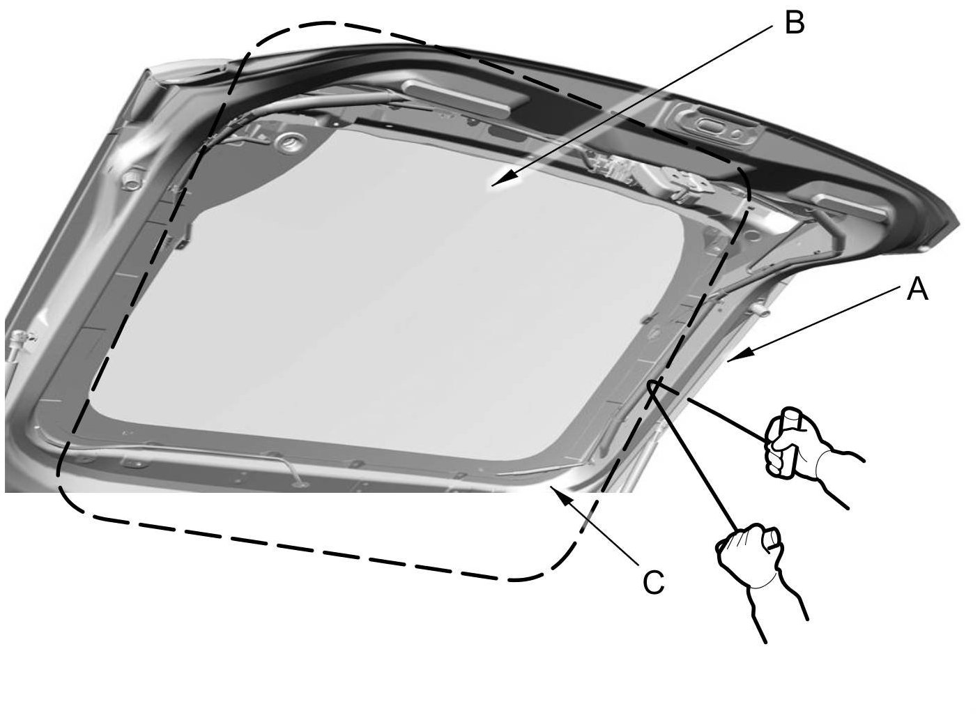 6. With a helper on the outside, pull the piano wire (A) back and forth in a sawing motion. Hold the piano wire as close to the upper rear window (B) as possible to prevent damage to the hatch, and carefully cut through the adhesive (C) around the entire upper rear window.