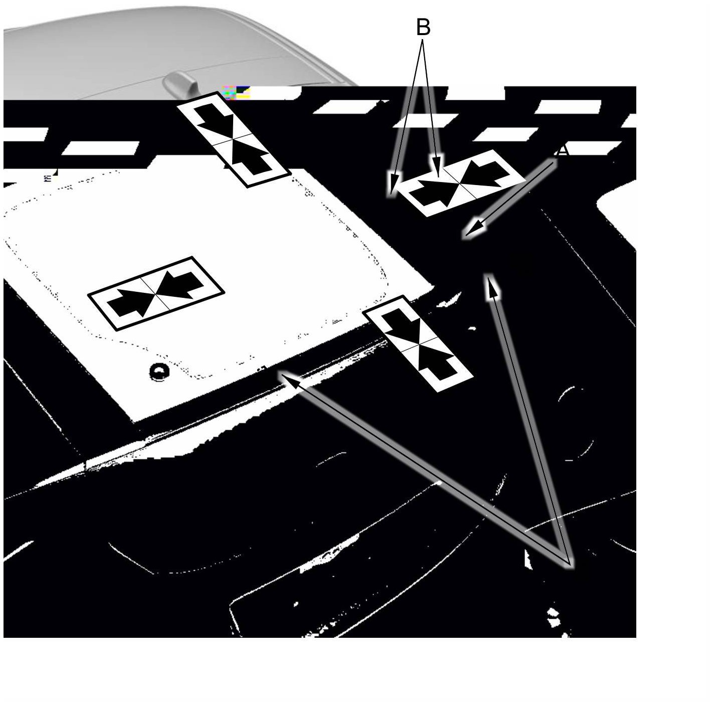 15. Set the upper rear window (A) in the opening, and center it. Make alignment marks (B) across the upper rear window and the body with a grease pencil at the four points shown. Be careful not to touch the upper rear window where the adhesive will be applied.