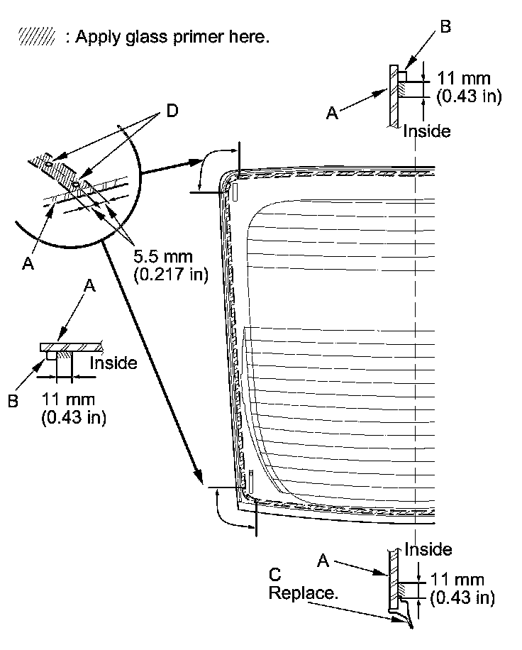 - Apply the glass primer to the corner areas of the upper rear window using the printed dots (D) on the upper rear window as a guide.