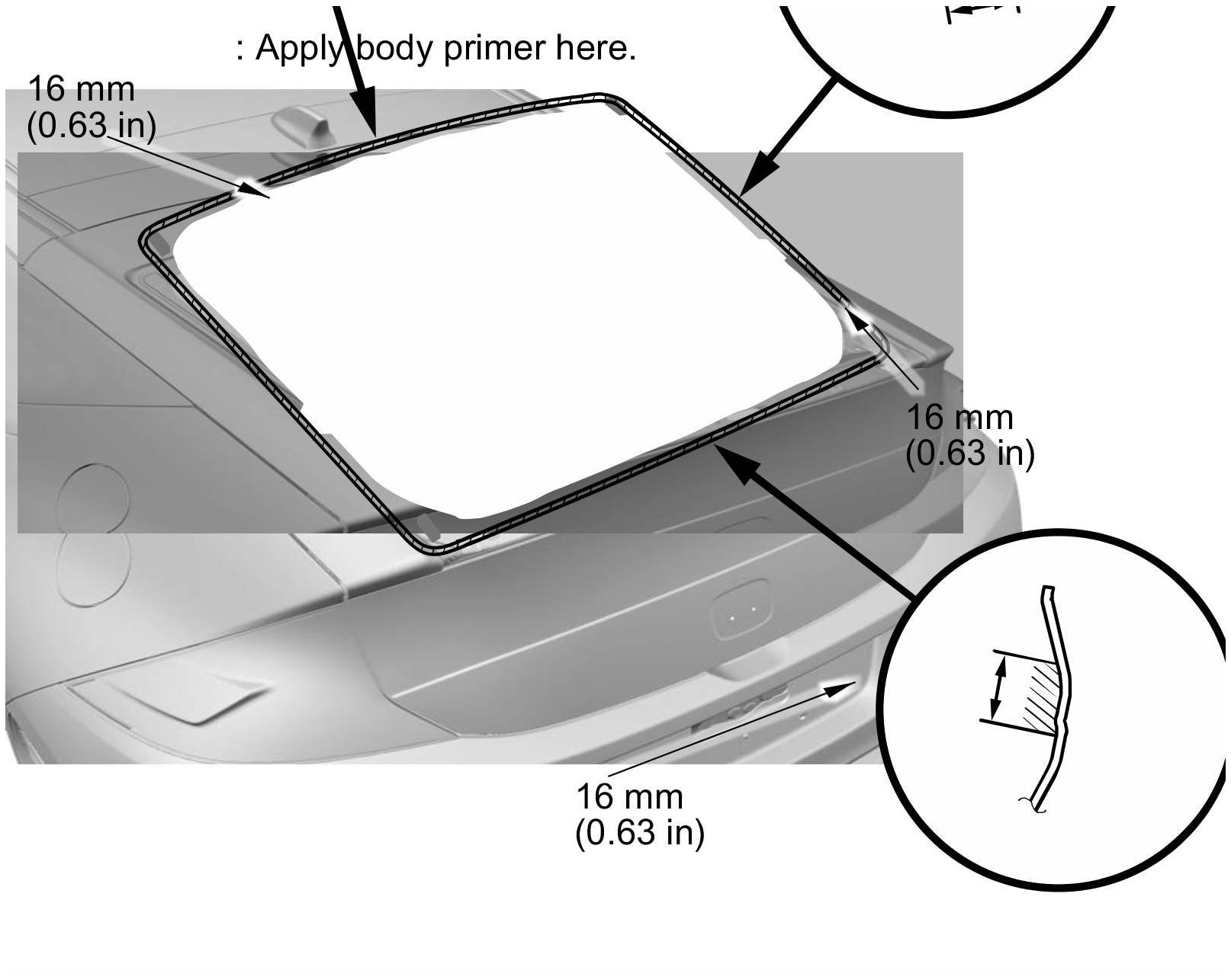 - Never touch the primed surfaces with your hands. If you do, the adhesive may not bond to the upper rear window properly, causing a leak after the upper rear window is installed.