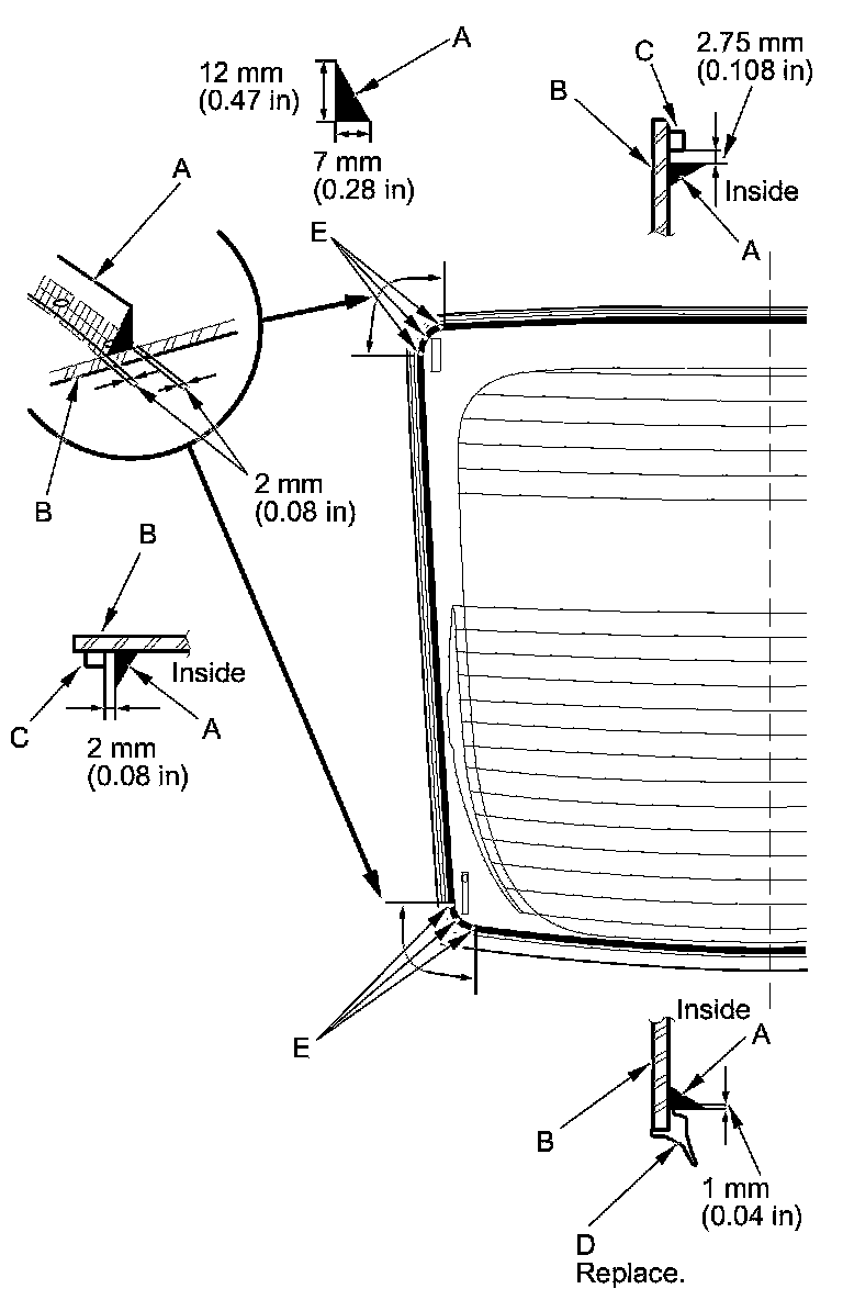 20. Pack adhesive into the cartridge without air pockets to ensure continuous delivery. Put the cartridge in a caulking gun, and run a bead of adhesive (A) to the upper rear window (B) along the edge of the rubber dams (C) and the lower seal (D) as shown: