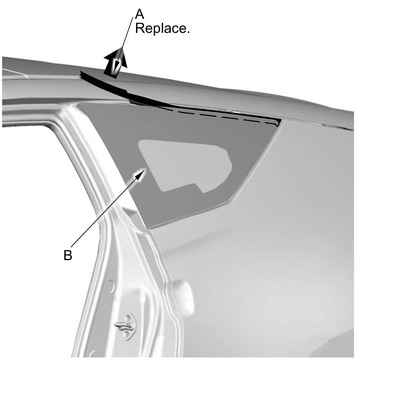 2. Remove the quarter glass molding (A) from the edge of the quarter glass (B). If necessary, cut the molding with a utility knife.