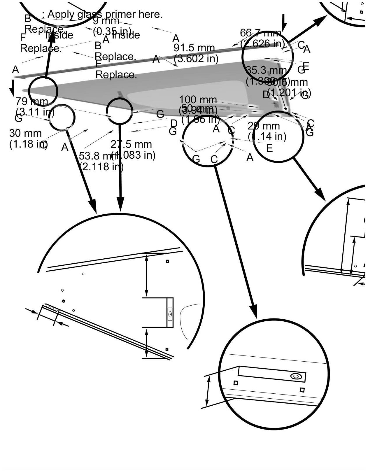 - With the printed dots (D) on the quarter glass as a guide, apply the glass primer to the upper, lower, and rear corner portions of the quarter glass.