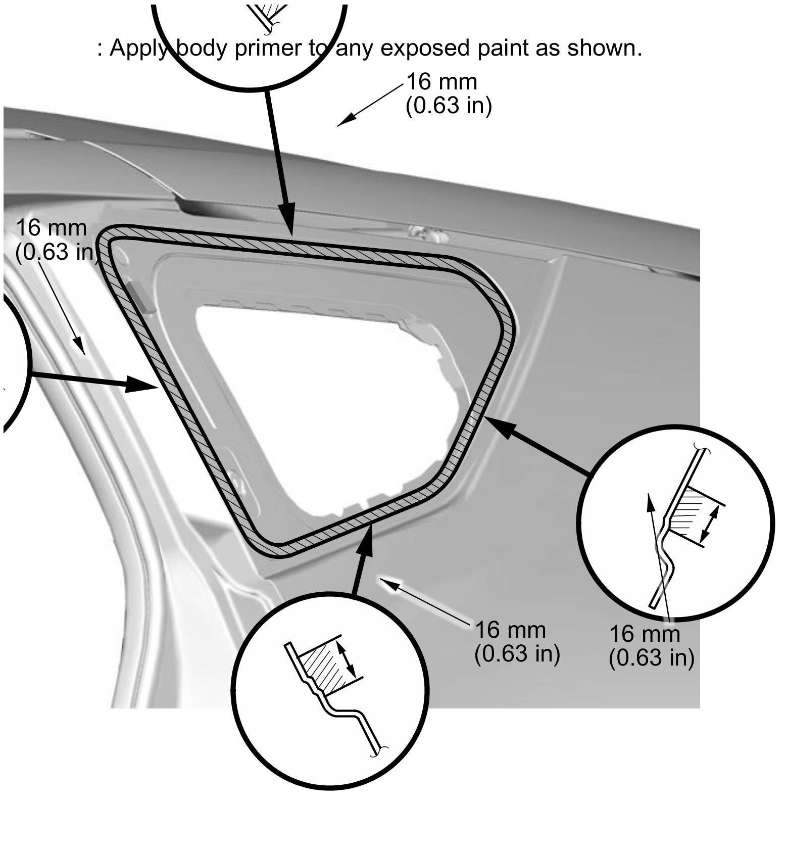 14. Carefully apply a light coat of body primer to any exposed paint or metal around the flange where new adhesive will be applied. Let the body primer dry for at least 10 minutes: