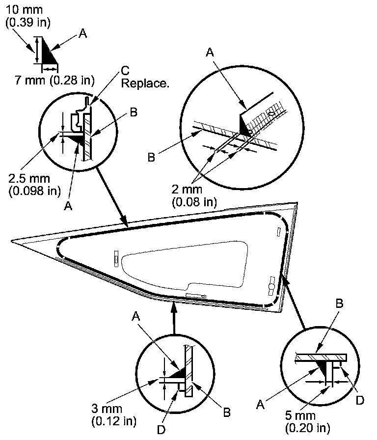 16. Pack adhesive into the cartridge without air pockets to ensure continuous delivery. Put the cartridge in a caulking gun, and run a continuous bead of adhesive (A) around the edge of the quarter glass (B) and along the molding (C) and the rubber dam (D) as shown.