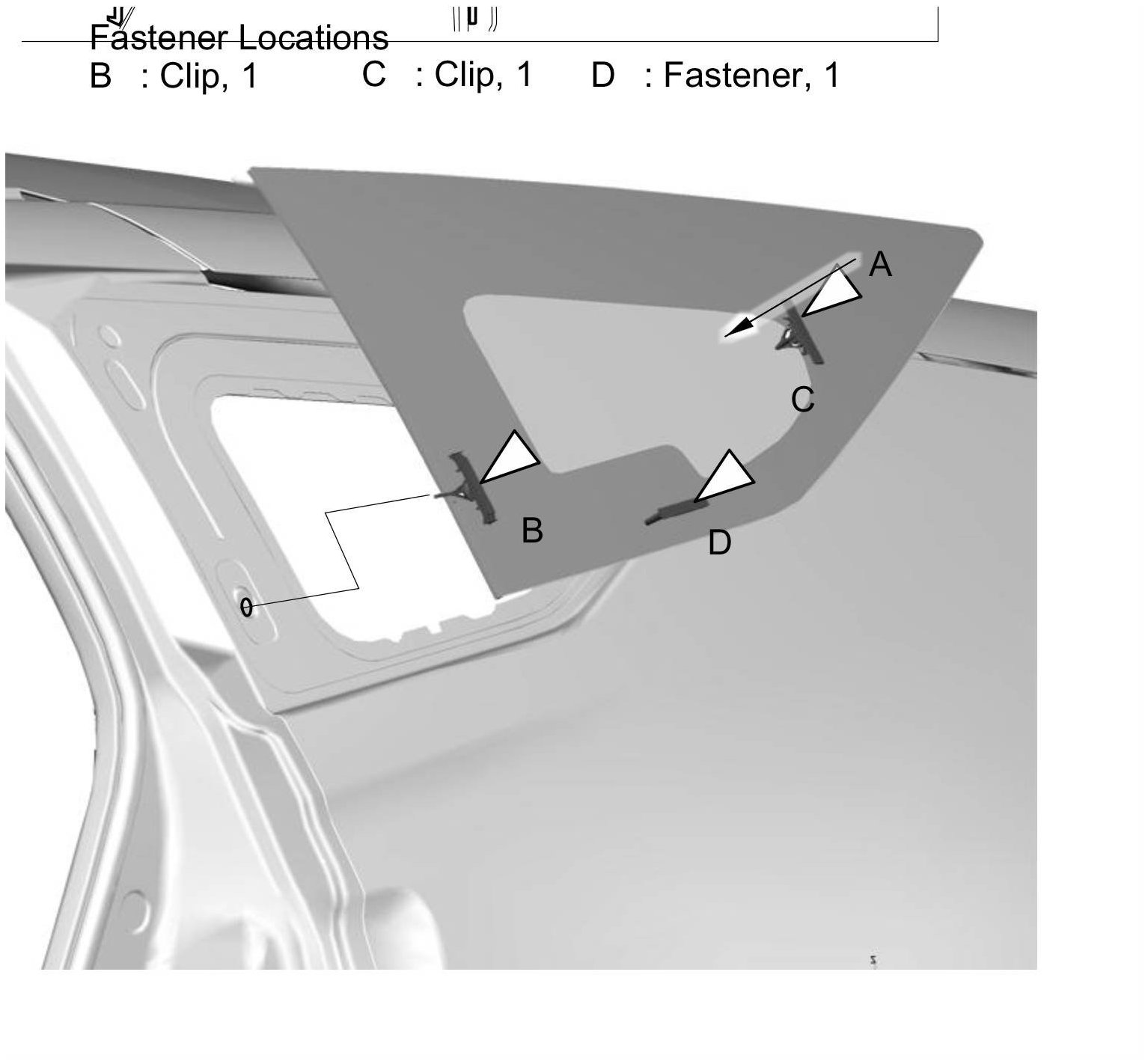 17. Hold the quarter glass (A) over the opening with suction cups, align it with the clips (B, C) and the fastener (D), and set it down on the adhesive. Lightly push on the quarter glass until its edges are fully seated on the adhesive all the way around.