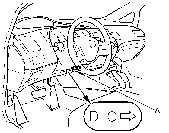 2. With the ignition switch in LOCK (0), connect the HDS to the data link connector (DLC) (A) under the driver's side of the dashboard.