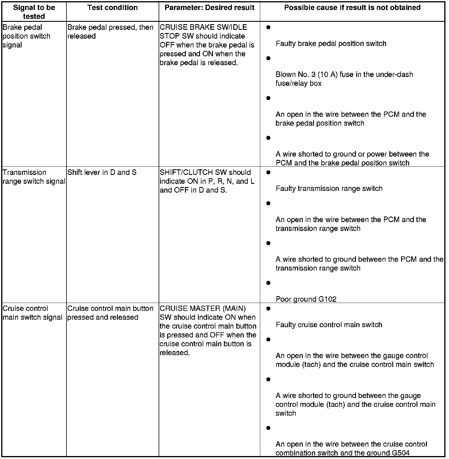 NOTE: Intermittent failures are often caused by loose circuit connections. While monitoring cruise control inputs, flex the circuit wires, and note if any of the test results change.