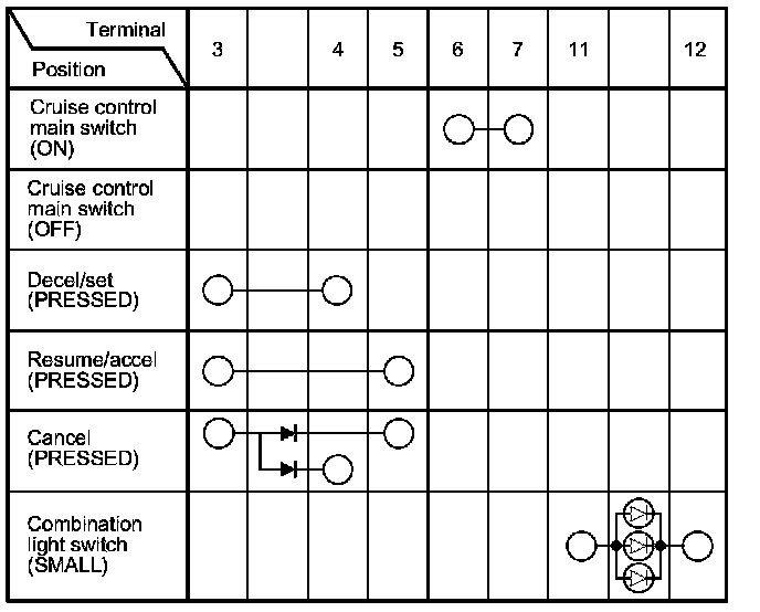 4. Check for continuity between the terminals in each cruise control combination switch position according to the table.