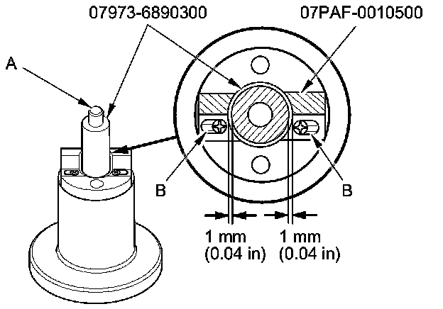 2. Temporarily install the pilot collar over the piston pin base insert (A), and adjust the piston base head inserts as shown, then tighten the screws (B). Remove the pilot collar.