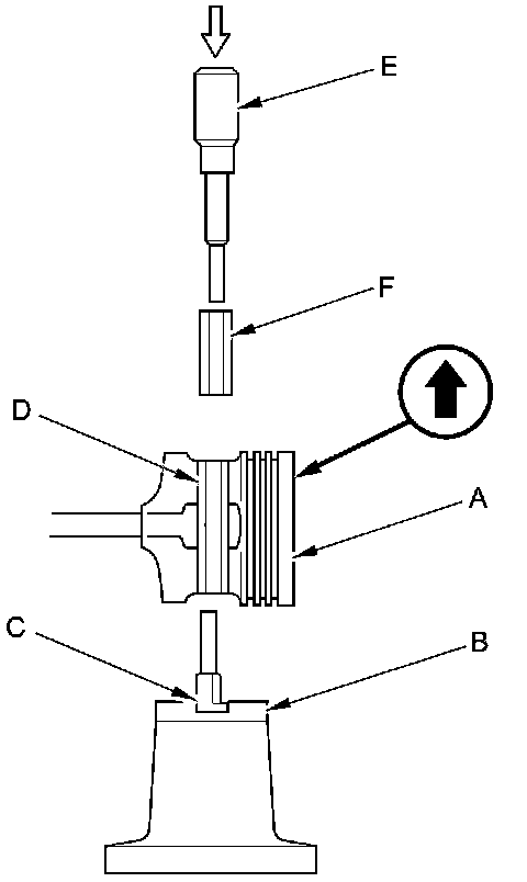 4. Press the piston pin (E) in with the adjustable piston pin driver head and shaft (F) and a hydraulic press.