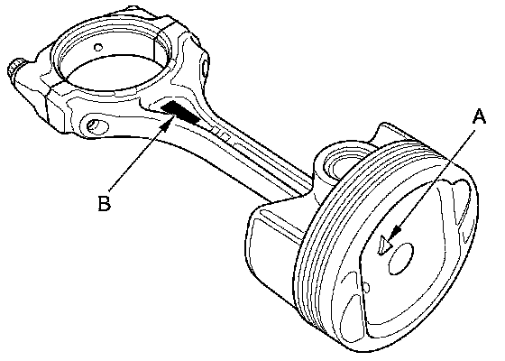 1. Assemble the piston with the arrow (A) pointing up and the connecting rod with the embossed marks (B) on the same side.