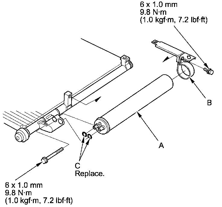 2. Remove the bolts from the A/C condenser, then remove the receiver/dryer (A), the bracket (B), and the O-rings (C).