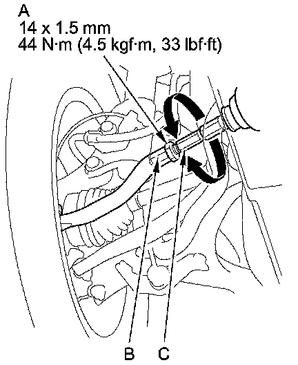 3. Loosen the tie-rod end locknuts (A) while holding the flat surface sections (B) of the tie-rod end with a wrench, and turn both tie-rods (C) until the front toe is within specifications.