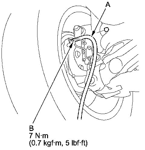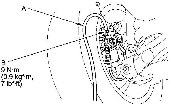 6. Attach a length of clear drain tube (A) to the bleed screw (B), then loosen the bleed screw to allow air to escape from the system. Then tighten the bleed screw securely.
