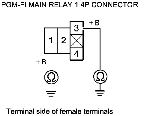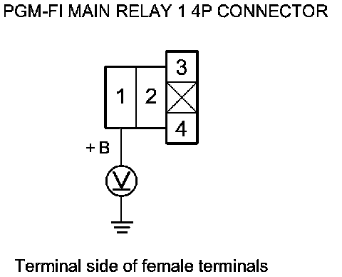 69. Measure the voltage between PGM-FI main relay 1 4P connector terminal No. 1 and body ground.
