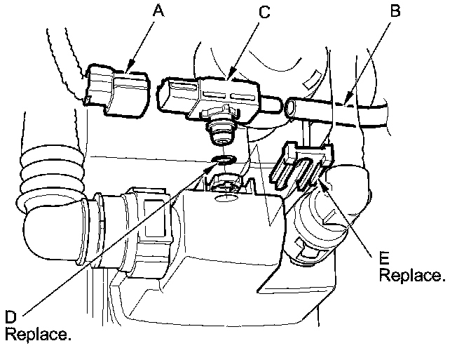 5. Install the parts in the reverse order of removal with a new O-ring (D) and retainer (E).