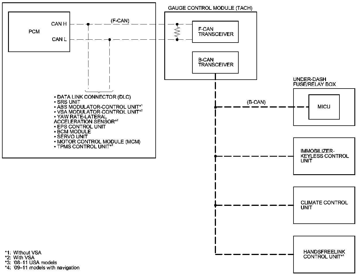 The body controller area network (B-CAN) and the fast controller area network (F-CAN) share information between multiple electronic control units (ECUs). B-CAN communication moves at a slower speed (33.33 kbps) for convenience related items and for other functions. F-CAN information moves at a faster speed (500 kbps) for " real time" functions such as fuel and emissions data. To allow both systems to share information, the gauge control module translates and relays the information from B-CAN to F-CAN and from F-CAN to B-CAN. This is called the Gateway Function.