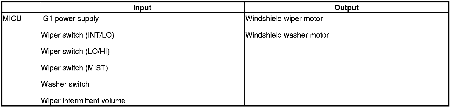 The MICU control of the windshield wiper motor and the windshield washer motor is based on inputs from each switch and the B-CAN data.