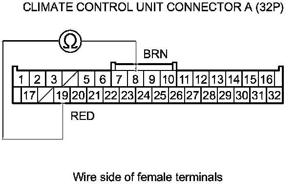 18. Measure the evaporator temperature sensor resistance between the climate control unit connector A (32P) terminals No. 8 and No. 19.