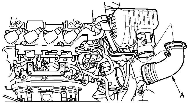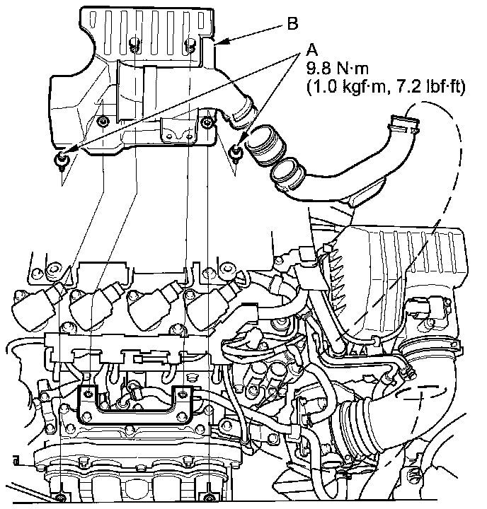 2. Remove the intake air resonator mounting bolts (A), then remove the intake air resonator (B).