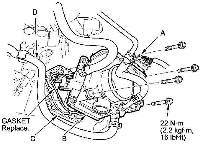 5. Remove the throttle body mounting bolts, and disconnect the connector (A), but leave the coolant hoses, and the EVAP hose connected. Remove the throttle body (B) and its gasket from the intake manifold (C) and set the throttle body aside.