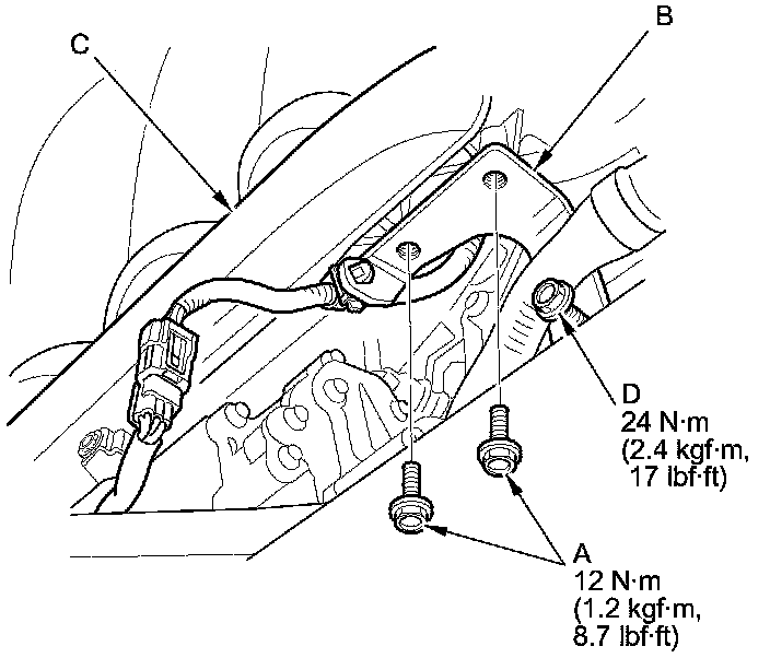 8. Remove the two bolts (A) connecting the intake manifold bracket (B) to the intake manifold chamber (C), and loosen the third bolt (D).