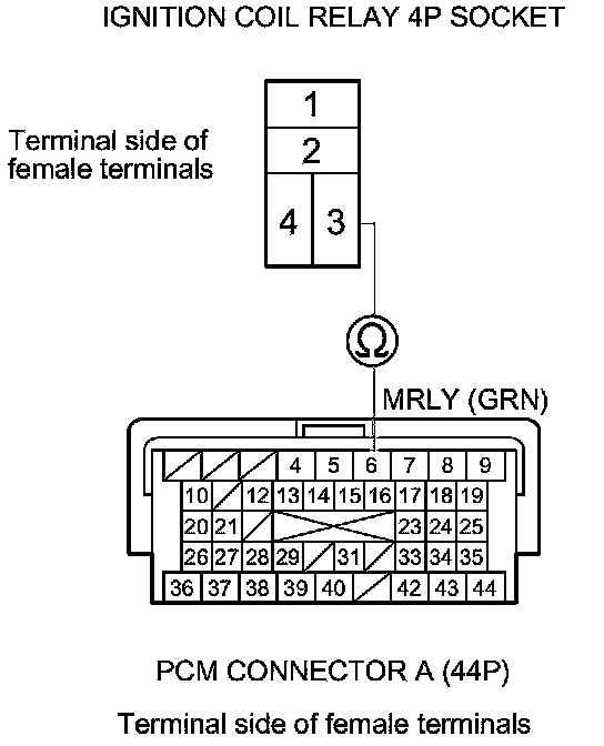 12. Check for continuity between ignition coil relay 4P socket terminal No. 3 and PCM connector terminal A6.