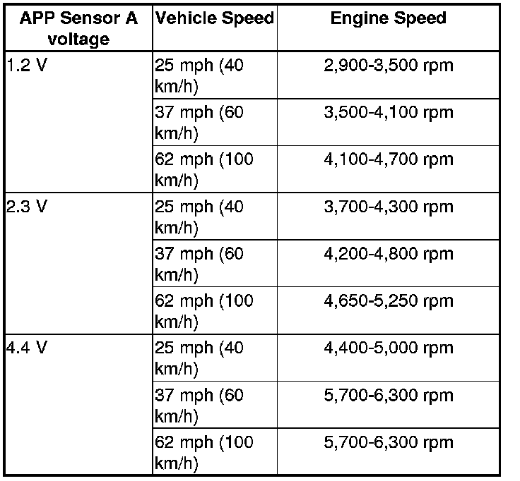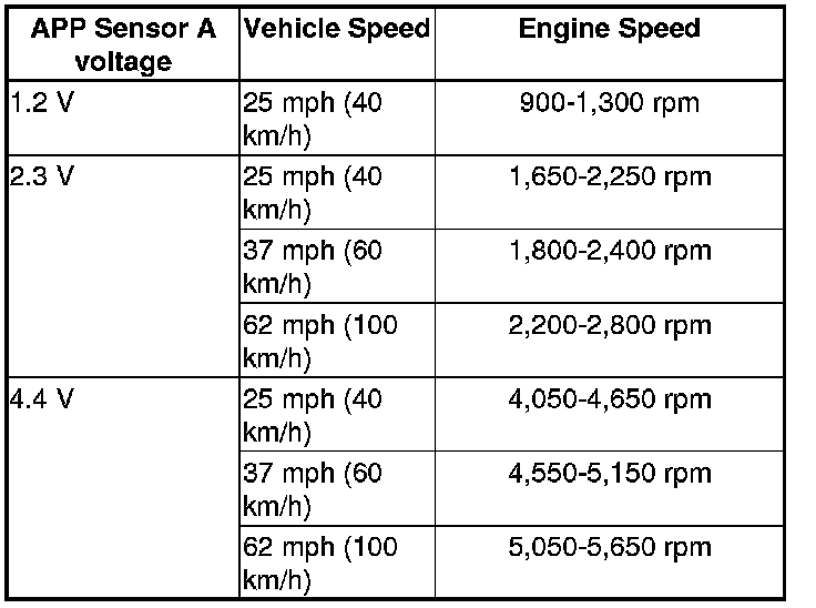 15. Review each snapshot individually, and compare the APP Sensor A (V) voltage, the Vehicle Speed, and the Engine Speed to the following table: