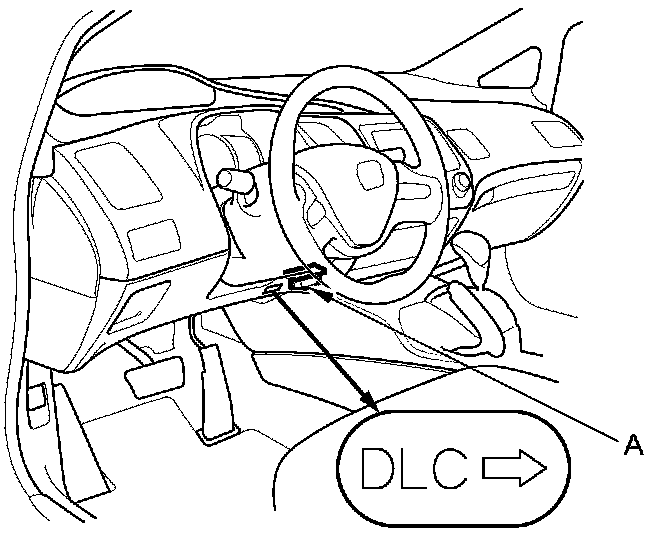 When the Honda Diagnostic System (HDS) is connected to the data link connector (DLC) (A) located under the driver's side of the dashboard, and when the ignition switch is turned to ON (II) and the appropriate menu is selected, it will indicate the diagnostic trouble code (DTC).