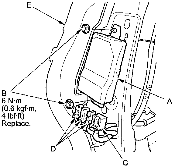 1. Place the ODS unit (A) on the seat-back frame. Tighten the two nuts (B), and connect the ODS unit 18P connector (C) and OPDS sensor connectors (D) to the ODS unit.