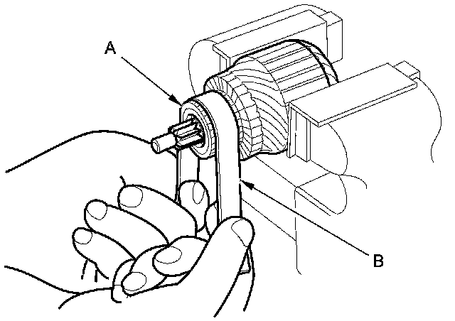 8. Place the armature (A) on an armature tester (B). Hold a hacksaw blade (C) on the armature core. If the blade is attracted to the core while the core is turned, the armature is shorted. Replace the armature.