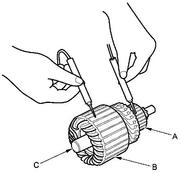 9. Use an ohmmeter to check for continuity between the commutator (A) and the armature coil core (B), and between the commutator and the armature shaft (C). If there is continuity, replace the armature.