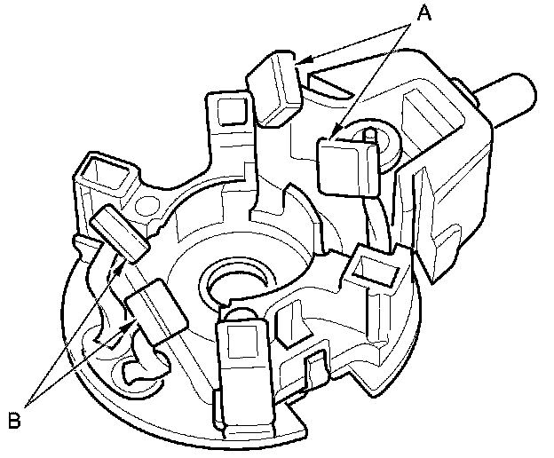 11. Check for continuity between the (+) brushes (A) and the (-) brushes (B). If there is continuity, replace the brush holder assembly.
