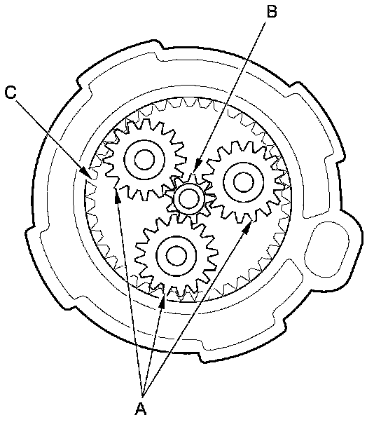 12. Check the planetary gears (A), the armature shaft gear (B), and the internal ring gear (C). Replace them if they are worn or damaged.
