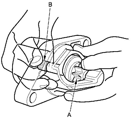 13. Holding the drive gear (A), turn the gear shaft (B) clockwise. Check that the drive gear comes out to the other end. If the drive gear does not move smoothly, replace the gear cover set.