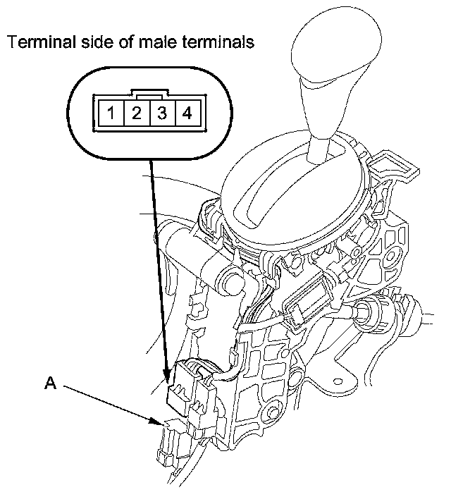 2. Disconnect the A/T gear position indicator panel light/park pin switch connector (A).