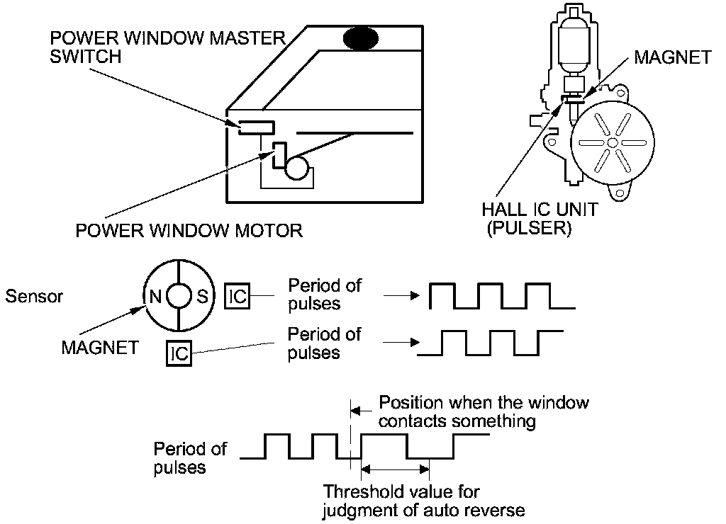 The driver's power window motor incorporates a Hall IC unit (pulser) which generates pulses during the motor's operation and sends the pulses to the driver's power window control unit. As soon as the power window control unit detects a change in pulse frequency from the Hall IC unit (pulser), the driver's power window control unit makes the power window motor stop and reverse. If the window is more than halfway closed, it will reverse to the half open position. If the window is less than halfway closed, it will stop and reverse about 2 in (50 mm). This is to prevents pinching your hand or fingers during auto-up operation. The auto reverse operation is not active when the switch is held in the up position.