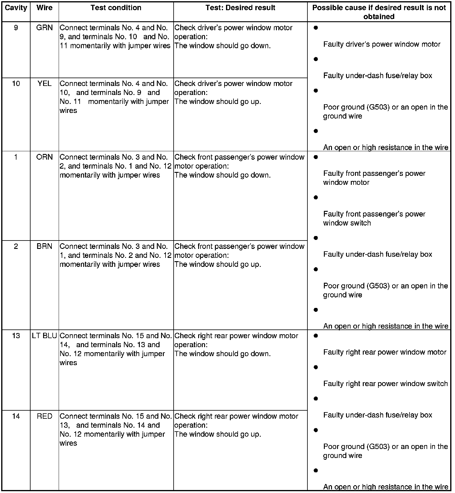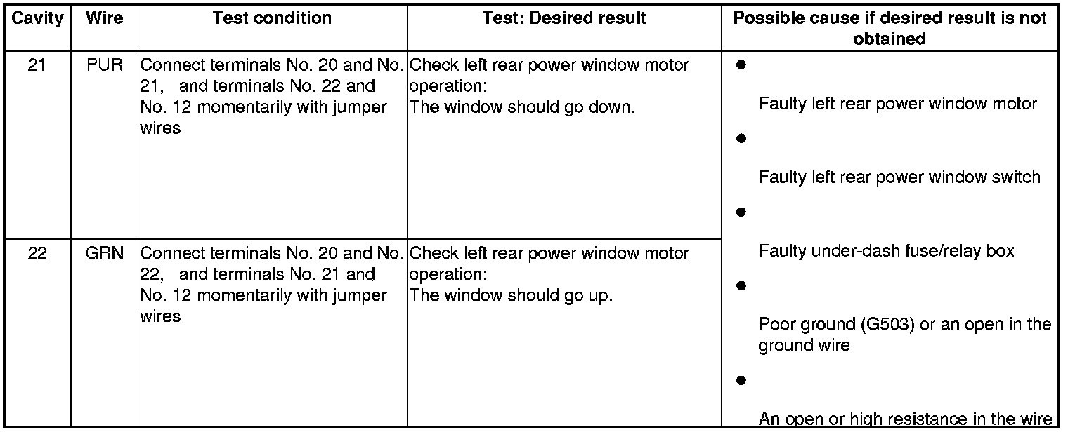 4. With the power window master switch still disconnected, do the following input tests: