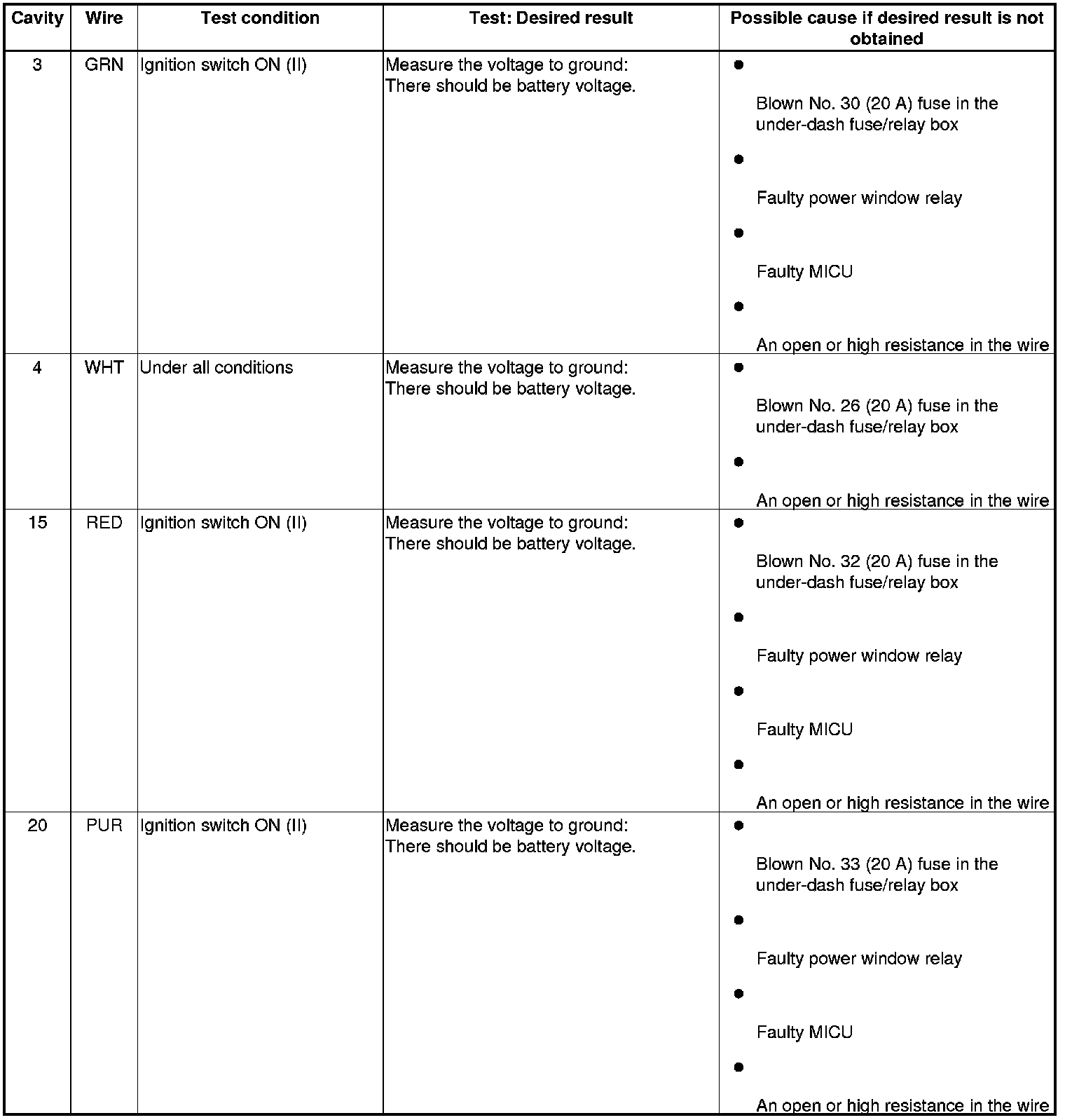 - Before testing, make sure the No. 26 (20 A), No. 30 (20 A), No. 32 (20 A), and No. 33 (20 A) fuses in the under-dash fuse/relay box are OK.