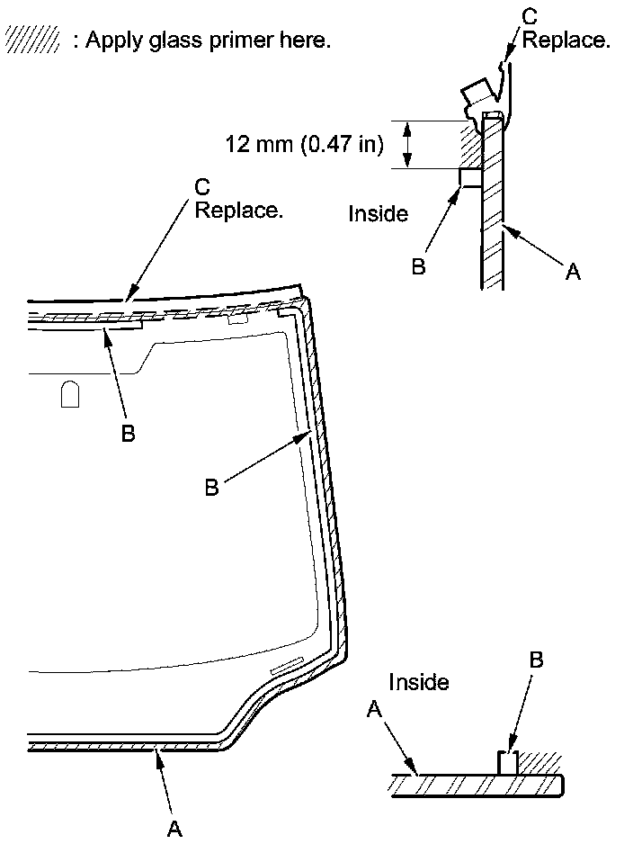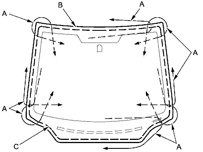 17. Apply a light coat of glass primer along the edge of the windshield (A) between the rubber dams (B) or the windshield molding (C) as shown, then lightly wipe it off with gauze or cheesecloth: