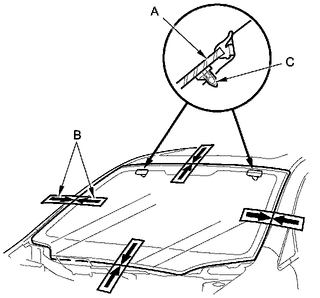 12. Attach the windshield molding (A) with adhesive tape (B) to the upper edge of the windshield (C). Be careful not to touch the windshield where the adhesive will be applied.