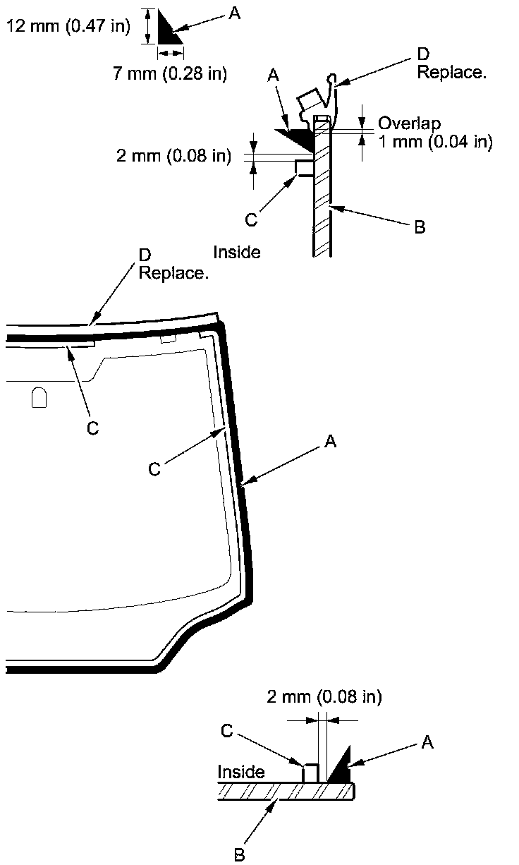 20. Put the cartridge in a caulking gun, and run a continuous bead of the adhesive (A) around the edge of the windshield (B) along the edge of the rubber dams (C) and the windshield molding (D) as shown: